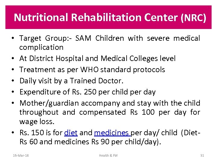 Child Malnutrition Treatment Centre (CMTC) Target Group: - SAM Children with medical complication At PHC / CHC / SDH level Treatment as per standard protocols Daily visit by a Trained Doctor. Follow a camp approach for 21 days Expenditure of Rs. 200 per child per day Mother/guardian accompany and stay with the child throughout and compensated Rs 100 per day for wage loss. • Rs. 100 is expended on diet and medicines per day/ child (Diet- Rs 60 and medicines Rs 40 per child/ day). • • 16 -Mar-18 Health & FW 30