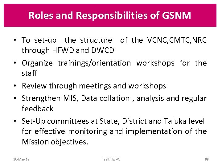 Roles and Responsibilities of GSNM • To set-up the structure of the VCNC, CMTC, NRC through HFWD and DWCD • Organize trainings/orientation workshops for the staff • Review through meetings and workshops • Strengthen MIS, Data collation , analysis and regular feedback • Set-Up committees at State, District and Taluka level for effective monitoring and implementation of the Mission objectives. 16 -Mar-18 Health & FW 33