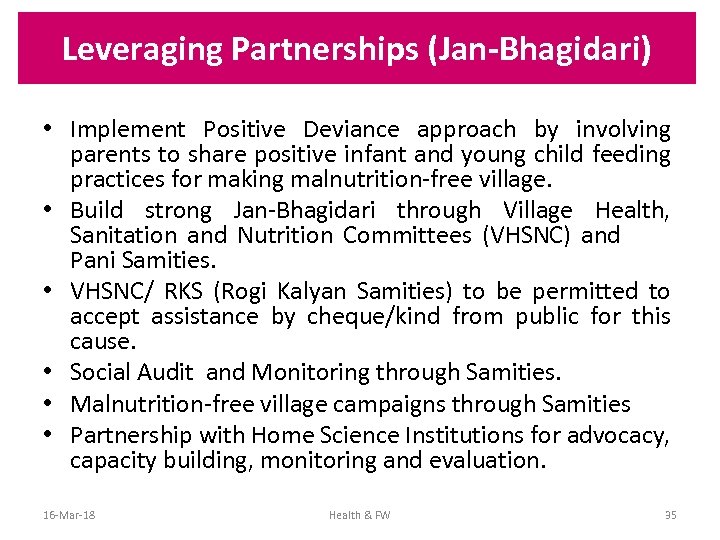 Leveraging Partnerships (Jan-Bhagidari) • Implement Positive Deviance approach by involving parents to share positive infant and young child feeding practices for making malnutrition-free village. • Build strong Jan-Bhagidari through Village Health, Sanitation and Nutrition Committees (VHSNC) and Pani Samities. • VHSNC/ RKS (Rogi Kalyan Samities) to be permitted to accept assistance by cheque/kind from public for this cause. • Social Audit and Monitoring through Samities. • Malnutrition-free village campaigns through Samities • Partnership with Home Science Institutions for advocacy, capacity building, monitoring and evaluation. 16 -Mar-18 Health & FW 35