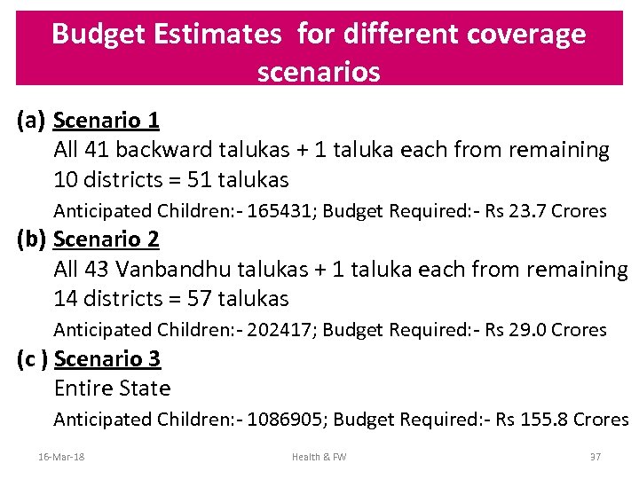 Budget Estimates for different coverage scenarios (a) Scenario 1 All 41 backward talukas + 1 taluka each from remaining 10 districts = 51 talukas Anticipated Children: - 165431; Budget Required: - Rs 23. 7 Crores (b) Scenario 2 All 43 Vanbandhu talukas + 1 taluka each from remaining 14 districts = 57 talukas Anticipated Children: - 202417; Budget Required: - Rs 29. 0 Crores (c ) Scenario 3 Entire State Anticipated Children: - 1086905; Budget Required: - Rs 155. 8 Crores 16 -Mar-18 Health & FW 37