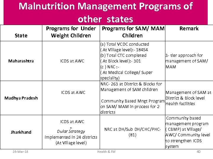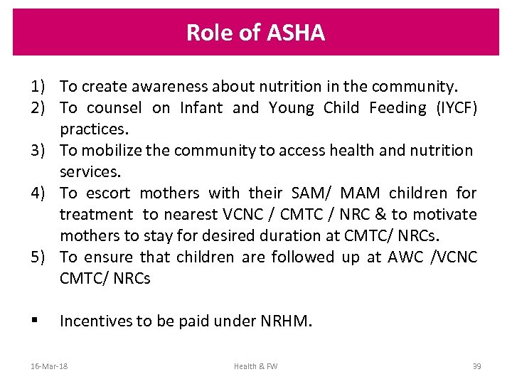 Role of ASHA 1) To create awareness about nutrition in the community. 2) To counsel on Infant and Young Child Feeding (IYCF) practices. 3) To mobilize the community to access health and nutrition services. 4) To escort mothers with their SAM/ MAM children for treatment to nearest VCNC / CMTC / NRC & to motivate mothers to stay for desired duration at CMTC/ NRCs. 5) To ensure that children are followed up at AWC /VCNC CMTC/ NRCs § Incentives to be paid under NRHM. 16 -Mar-18 Health & FW 39
