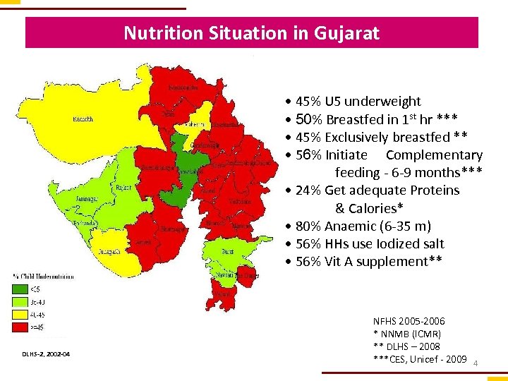 Nutrition Situation of various States of India Tamil Nadu Maharashtra Uttranchal Rajasthan Orrissa Uttar Pradesh INDIA Gujarat Meghalaya Bihar Jharkhand Madhya Pradesh 30 37 38 40 41 42 43 45 48 56 57 60 45 % Children (<5 Yrs) of Gujarat are underweight. National Family Health Survey-3, 2005 – 06, Gujarat 3