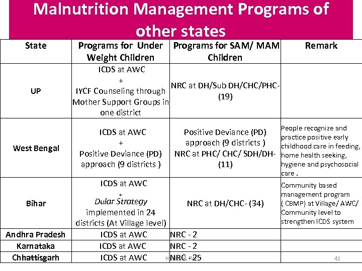 Malnutrition Management Programs of other states State UP West Bengal Programs for Under Weight Children Programs for SAM/ MAM Children ICDS at AWC + NRC at DH/Sub DH/CHC/PHC- IYCF Counseling through (19) Mother Support Groups in one district ICDS at AWC + Positive Deviance (PD) approach (9 districts ) Positive Deviance (PD) People recognize and practice positive early approach (9 districts ) childhood care in feeding, NRC at PHC/ CHC/ SDH/DH- home health seeking, hygiene and psychosocial (11) ICDS at AWC Bihar Andhra Pradesh Karnataka Chhattisgarh 16 -Mar-18 Remark + Dular Strategy NRC at DH/CHC- (34) implemented in 24 districts (At Village level) ICDS at AWC NRC - 25 Health & FW care. Community based management program ( CBMP) at Village/ AWC/ Community level to strengthen ICDS system 41