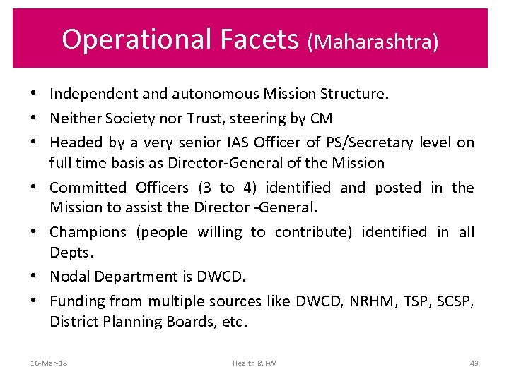 Operational Facets (Maharashtra) • Independent and autonomous Mission Structure. • Neither Society nor Trust, steering by CM • Headed by a very senior IAS Officer of PS/Secretary level on full time basis as Director-General of the Mission • Committed Officers (3 to 4) identified and posted in the Mission to assist the Director -General. • Champions (people willing to contribute) identified in all Depts. • Nodal Department is DWCD. • Funding from multiple sources like DWCD, NRHM, TSP, SCSP, District Planning Boards, etc. 16 -Mar-18 Health & FW 43