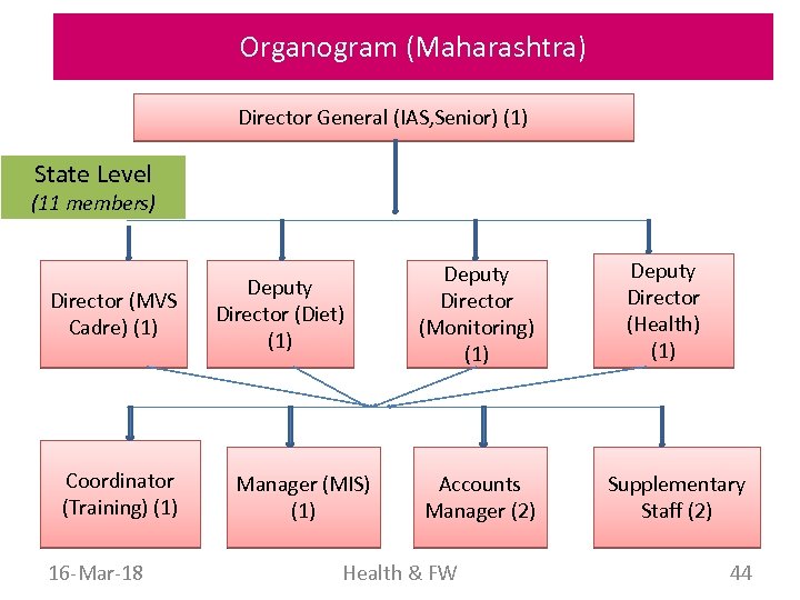 Organogram (Maharashtra) Director General (IAS, Senior) (1) State Level (11 members) Director (MVS Cadre) (1) Coordinator (Training) (1) 16 -Mar-18 Deputy Director (Diet) (1) Manager (MIS) (1) Deputy Director (Monitoring) (1) Accounts Manager (2) Health & FW Deputy Director (Health) (1) Supplementary Staff (2) 44