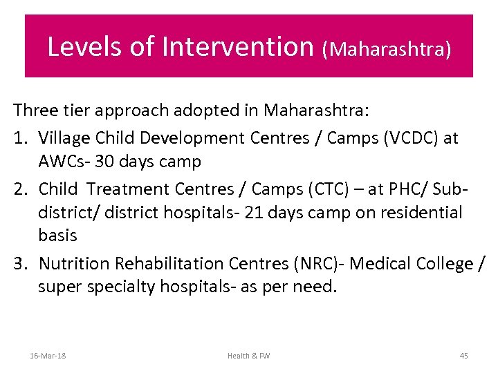 Levels of Intervention (Maharashtra) Three tier approach adopted in Maharashtra: 1. Village Child Development Centres / Camps (VCDC) at AWCs- 30 days camp 2. Child Treatment Centres / Camps (CTC) – at PHC/ Subdistrict/ district hospitals- 21 days camp on residential basis 3. Nutrition Rehabilitation Centres (NRC)- Medical College / super specialty hospitals- as per need. 16 -Mar-18 Health & FW 45