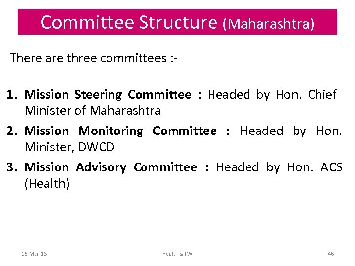 Committee Structure (Maharashtra) There are three committees : - 1. Mission Steering Committee : Headed by Hon. Chief Minister of Maharashtra 2. Mission Monitoring Committee : Headed by Hon. Minister, DWCD 3. Mission Advisory Committee : Headed by Hon. ACS (Health) 16 -Mar-18 Health & FW 46