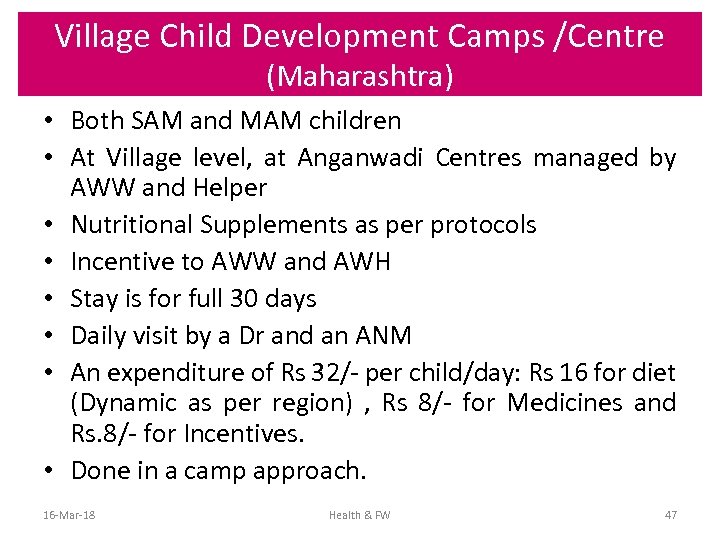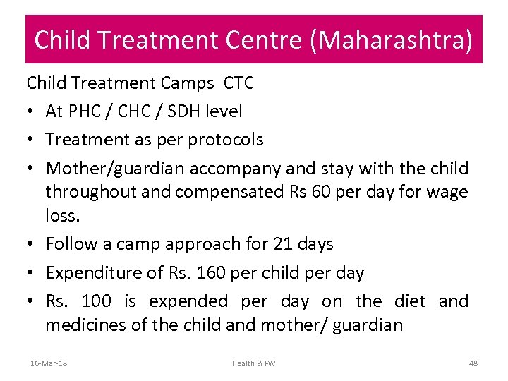 Village Child Development Camps /Centre (Maharashtra) • Both SAM and MAM children • At Village level, at Anganwadi Centres managed by AWW and Helper • Nutritional Supplements as per protocols • Incentive to AWW and AWH • Stay is for full 30 days • Daily visit by a Dr and an ANM • An expenditure of Rs 32/- per child/day: Rs 16 for diet (Dynamic as per region) , Rs 8/- for Medicines and Rs. 8/- for Incentives. • Done in a camp approach. 16 -Mar-18 Health & FW 47