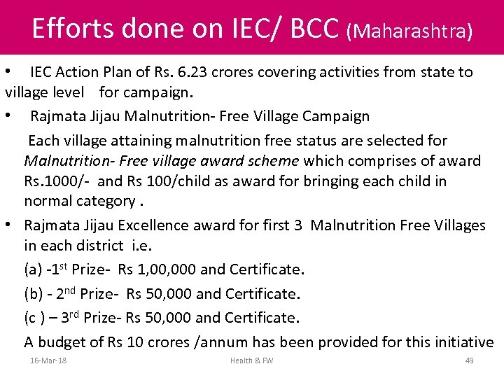 Efforts done on IEC/ BCC (Maharashtra) • IEC Action Plan of Rs. 6. 23 crores covering activities from state to village level for campaign. • Rajmata Jijau Malnutrition- Free Village Campaign Each village attaining malnutrition free status are selected for Malnutrition- Free village award scheme which comprises of award Rs. 1000/- and Rs 100/child as award for bringing each child in normal category. • Rajmata Jijau Excellence award for first 3 Malnutrition Free Villages in each district i. e. (a) -1 st Prize- Rs 1, 000 and Certificate. (b) - 2 nd Prize- Rs 50, 000 and Certificate. (c ) – 3 rd Prize- Rs 50, 000 and Certificate. A budget of Rs 10 crores /annum has been provided for this initiative 16 -Mar-18 Health & FW 49