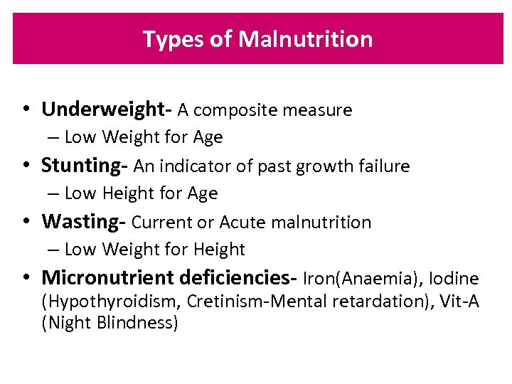 Types of Malnutrition • Underweight- A composite measure – Low Weight for Age • Stunting- An indicator of past growth failure – Low Height for Age • Wasting- Current or Acute malnutrition – Low Weight for Height • Micronutrient deficiencies- Iron(Anaemia), Iodine (Hypothyroidism, Cretinism-Mental retardation), Vit-A (Night Blindness)