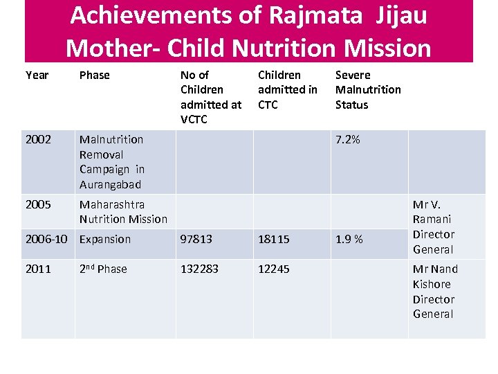 Achievements of Rajmata Jijau Mother- Child Nutrition Mission Year Phase 2002 Malnutrition Removal Campaign in Aurangabad 2005 No of Children admitted at VCTC Children admitted in CTC Maharashtra Nutrition Mission 7. 2% 2006 -10 Expansion 97813 18115 2011 132283 12245 2 nd Phase Severe Malnutrition Status 1. 9 % Mr V. Ramani Director General Mr Nand Kishore Director General