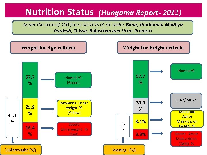 Nutrition Status (Hungama Report- 2011) As per the data of 100 focus districts of six states Bihar, Jharkhand, Madhya Pradesh, Orissa, Rajasthan and Uttar Pradesh Weight for Age criteria 57. 7 % Normal % [Green] 25. 9 % Severe Underweight % (Red) 30. 9 % Moderate Under weight % [Yellow] 16. 4 % 42. 3 % Weight for Height criteria Underweight (%) 11. 4 % 8. 1% 3. 3% Wasting (%) Normal % SUW/ MUW Moderate Acute Malnutrition (MAM) % Severe Acute Malnutrition (SAM) %