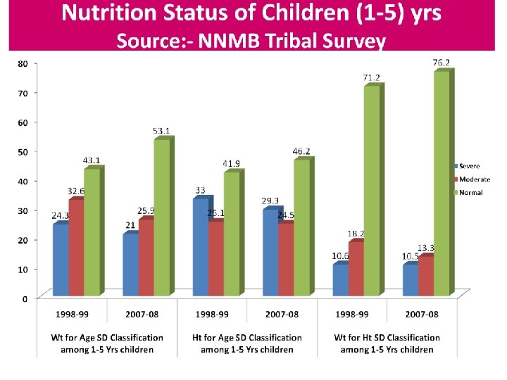 Nutrition Status in Gujarat Source: - NFHS- 3 (2005 -06) Weight for Age criteria 55. 4 % 44. 6 % 28. 3 % 16. 3 % Underweight (%) Weight for Height criteria 55. 4 % Normal % [Green] 25. 9 % Moderate Under Weight % [Yellow] Severe Under Weight % (Red) 18. 7 % 12. 9 % 5. 8% Wasting (%) Normal % SUW/ MUW Moderate Acute Malnutrition (MAM) % Severe Acute Malnutrition (SAM) %