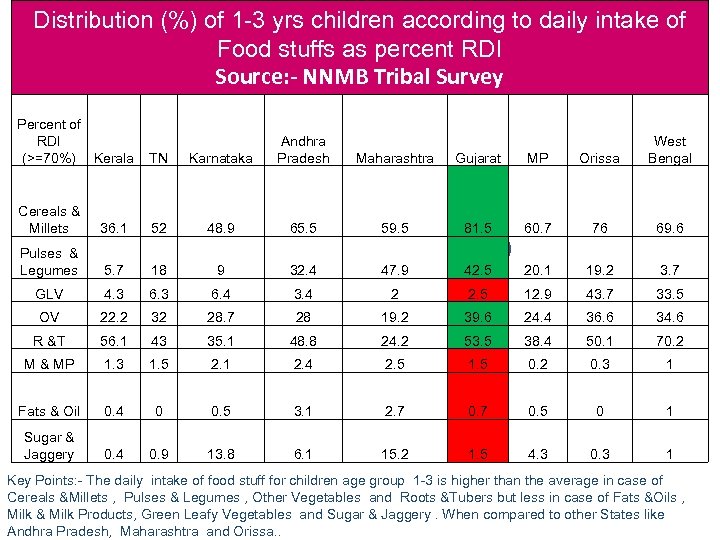 Distribution (%) of 1 -3 yrs children according to daily intake of Food stuffs as percent RDI Source: - NNMB Tribal Survey Percent of RDI (>=70%) Kerala TN Cereals & Millets 36. 1 Pulses & Legumes Karnataka Andhra Pradesh Maharashtra Gujarat MP Orissa West Bengal 52 48. 9 65. 5 59. 5 81. 5 60. 7 76 69. 6 5. 7 18 9 32. 4 47. 9 42. 5 20. 1 19. 2 3. 7 GLV 4. 3 6. 4 3. 4 2 2. 5 12. 9 43. 7 33. 5 OV 22. 2 32 28. 7 28 19. 2 39. 6 24. 4 36. 6 34. 6 R &T 56. 1 43 35. 1 48. 8 24. 2 53. 5 38. 4 50. 1 70. 2 M & MP 1. 3 1. 5 2. 1 2. 4 2. 5 1. 5 0. 2 0. 3 1 Fats & Oil 0. 4 0 0. 5 3. 1 2. 7 0. 5 0 1 Sugar & Jaggery 0. 4 0. 9 13. 8 6. 1 15. 2 1. 5 4. 3 0. 3 1 Key Points: - The daily intake of food stuff for children age group 1 -3 is higher than the average in case of Cereals &Millets , Pulses & Legumes , Other Vegetables and Roots &Tubers but less in case of Fats &Oils , Milk & Milk Products, Green Leafy Vegetables and Sugar & Jaggery. When compared to other States like Andhra Pradesh, Maharashtra and Orissa. .