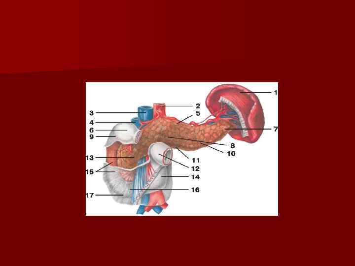 Поджелудочная железа n Местоположение – брюшная полость, позади желудка n Железа смешанной секреции Части Экзокринная Эндокринная α - клетки β – клетки