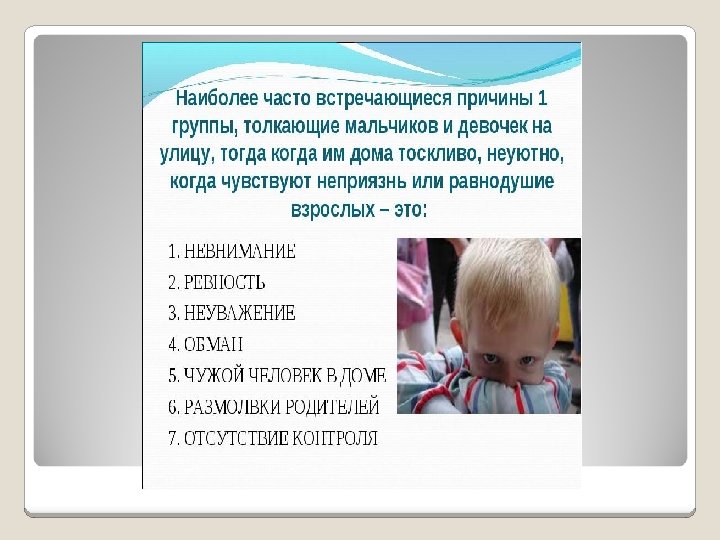 Социально-психологические факторы ухода детей из семьи. По статистике, основной возраст уходов детей и подростков из семьи - 10 -17 лет. Дети уходят не только из неблагополучных семей. Как показывает практика, около 70 процентов – дети, воспитывающиеся в относительно благополучных семьях. Дети уходят из дома: - в поисках приключений; - - в знак протеста против чрезмерной опеки родителей; - -пытаясь привлечь их внимание; - - в результате конфликтов со сверстниками или в семье.