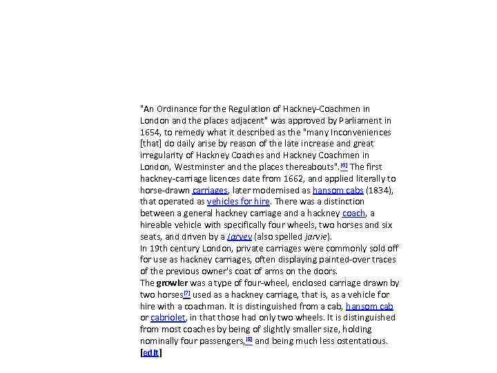 "An Ordinance for the Regulation of Hackney-Coachmen in London and the places adjacent" was approved by Parliament in 1654, to remedy what it described as the "many Inconveniences [that] do daily arise by reason of the late increase and great irregularity of Hackney Coaches and Hackney Coachmen in London, Westminster and the places thereabouts". [6] The first hackney-carriage licences date from 1662, and applied literally to horse-drawn carriages, later modernised as hansom cabs (1834), that operated as vehicles for hire. There was a distinction between a general hackney carriage and a hackney coach, a hireable vehicle with specifically four wheels, two horses and six seats, and driven by a Jarvey (also spelled jarvie). In 19 th century London, private carriages were commonly sold off for use as hackney carriages, often displaying painted-over traces of the previous owner's coat of arms on the doors. The growler was a type of four-wheel, enclosed carriage drawn by two horses[7] used as a hackney carriage, that is, as a vehicle for hire with a coachman. It is distinguished from a cab, hansom cab or cabriolet, in that those had only two wheels. It is distinguished from most coaches by being of slightly smaller size, holding nominally four passengers, [8] and being much less ostentatious. [edit]