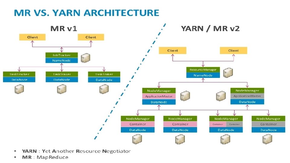 YARN Sometimes called Map. Reduce 2. 0, YARN decouples scheduling capabilities from the data processing component Hadoop clusters can now run interactive querying and streaming data applications simultaneously. Separating HDFS from Map. Reduce with YARN makes the Hadoop environment more suitable for operational applications that can't wait for batch jobs to finish.