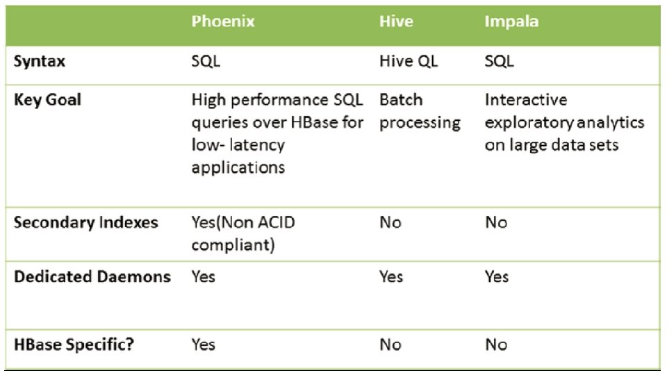 Apache Phoenix is an open source, massively parallel, relational database engine supporting OLTP for Hadoop using Apache HBase as its backing store. Phoenix provides a JDBC driver that hides the intricacies of the no. SQL store enabling users to create, delete, and alter SQL tables, views, indexes, and sequences; insert and delete rows singly and in bulk; and query data through SQL. Phoenix compiles queries and other statements into native no. SQL store APIs rather than using Map. Reduce enabling the building of low latency applications on top of no. SQL stores. Apache phoenix is a good choice for low-latency and mid-size table (1 M - 100 M rows) Apache phoenix is faster than Hive, and Impala