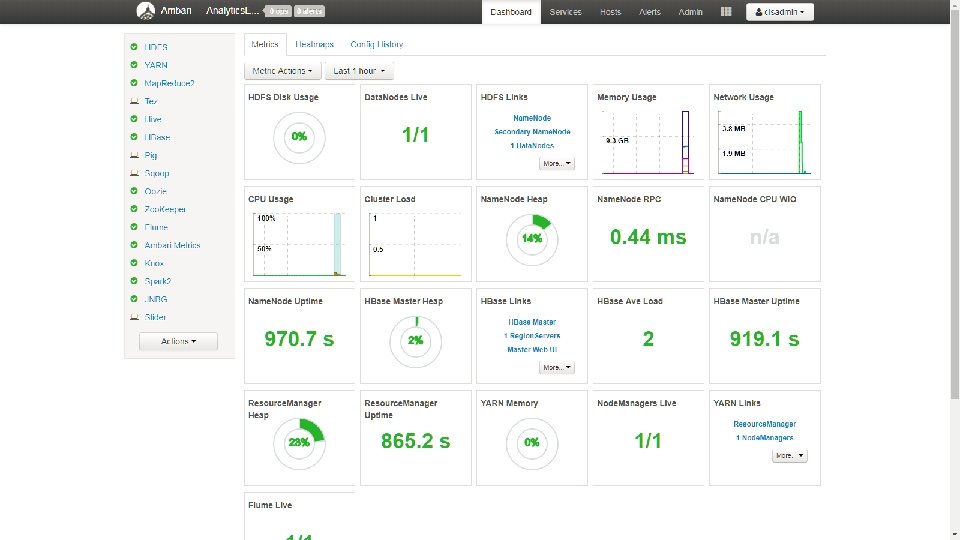 Zoo. Keeper • Zookeeper is a distributed coordination service that manages large sets of nodes. On any partial failure, clients can connect to any node to receive correct, up-to-date information • Services depend on Zoo. Keeper Hbase, Map. Reduce, and Flume Z-Node • znode is a file that persists in memory on the Zoo. Keeper servers • znode can be updated by any node in the cluster • Applications can synchronize their tasks across the distributed cluster by updating their status in a Zoo. Keeper znode, which would then inform the rest of the cluster of a specific node’s status change. • ZNode Shell command: Create, delete, exists, get. Children, get. Data, set. Data, get. ACL, sync Watches events • any node in the cluster can register to be informed of changes to specific znode (watch) • Watches are one-time triggers and always ordered. Client sees watched event before new ZNode data. • ZNode watches events: Node. Children. Changed, Node. Created, Node. Data. Changed, Node. Deleted