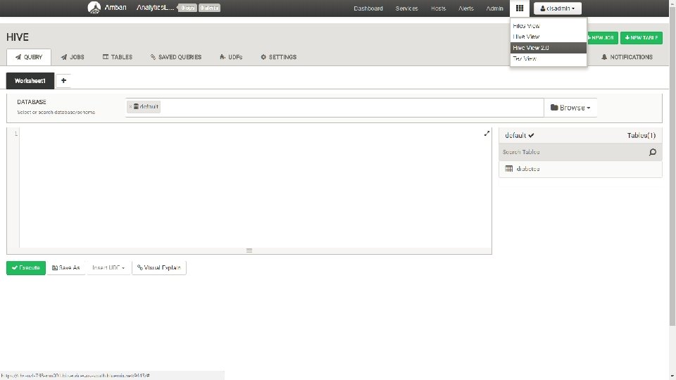 AMBARI (GUI TOOLS TO MANAGE HADOOP) Ambari View is developed by Horton. Works. Ambari is a GUI tool you can use to create(install) manage the entire hadoop cluster. You can keep on expanding by adding nodes and monitor the health, space utilization etc through Ambari views are more to help users to use the installed components/services like hive, pig, capacity scheduler to see the cluster-load and manage YARN workload management, provisioning cluster resources, manage files etc. We have another GUI tool with name HUE developed by Cloudera