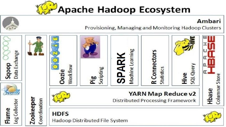 Spark with Hadoop 2+ • Spark is an alternative in-memory framework to Map. Reduce • Supports general workloads as well as streaming, interactive queries and machine learning providing performance gains • Spark jobs can be written in Scala, Python, or Java; APIs are available for all three • Run Spark Scala shells by (spark-shell) Spark Python shells by (pyspark) Apache Spark was the world record holder in 2014 for sorting. By sorting 100 TB of data on 207 machines in 23 minutes but Hadoop Map. Reduce took 72 minutes on 2100 machines.
