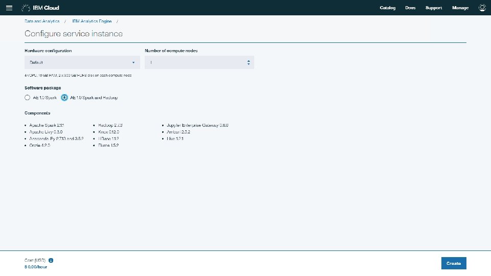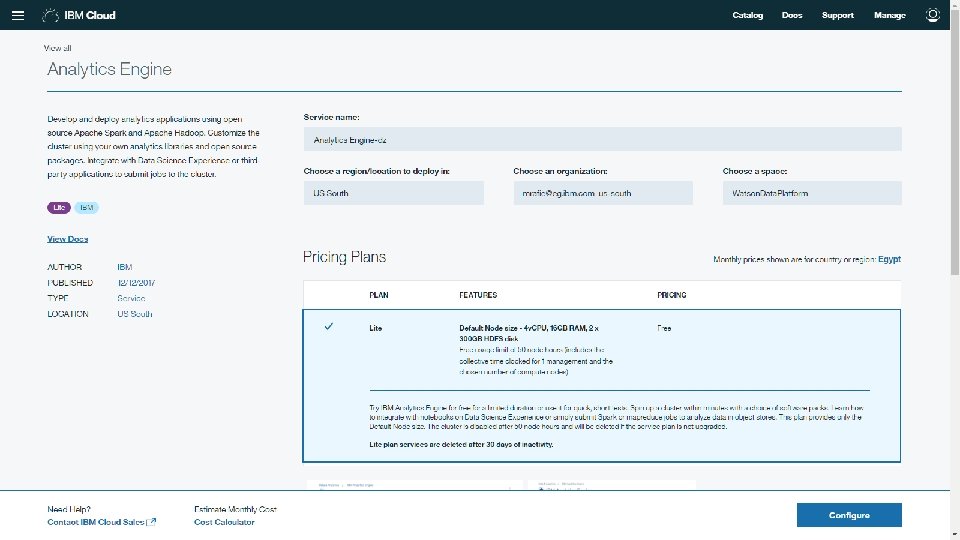 How to work with Hadoop on IBM cloud Login to IBM Cloud (Blue. Mix), and search for Hadoop You will get two results (Lite = Free), and (Subscription=with Cost) choose “Analytics Engine”