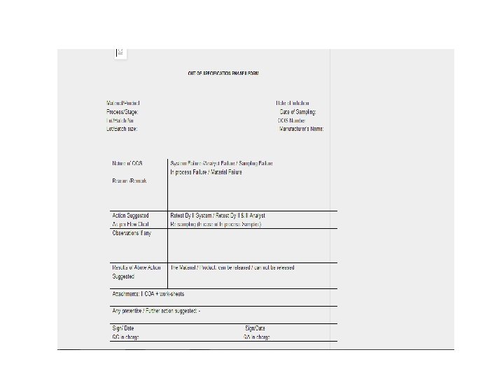 Intimation of the OOS (1) • Intimate to materials departments and corporate QA of the OOS in case of rejection. • QA Chemist to fill the final rejection note. • This note should include the following things: OOS No. / Item code / Used for / Item name / Date of receipt / Control no. / Supplier’s consignment no. / Supplier’s name / Referred specification no. / Reason for rejection.