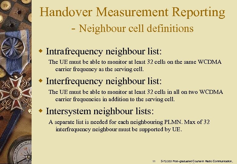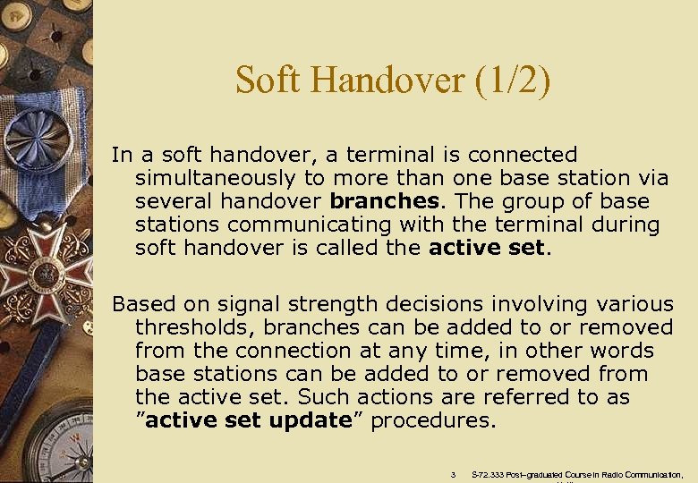 Content 1. Handover • • • Soft handover Softer handover Inter-frequency handover Intra-frequency handover Inter-system handover 2. Cell info for Handover Measurement Reporting • • Neighbour cell definitions Cell List 3. Measurement Reporting Criteria • Intrafrequency measurements • • Interfrequency and Intersystem Measurements UE Internal Measurements 4. Reporting Measurement Results 2 S-72. 333 Post–graduated Course in Radio Communication,