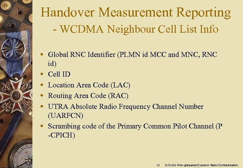 Handover Measurement Reporting - WCDMA Neighbour Cell List Info w Global RNC Identifier (PLMN id MCC and MNC, RNC id) w Cell ID w Location Area Code (LAC) w Routing Area Code (RAC) w UTRA Absolute Radio Frequency Channel Number (UARFCN) w Scrambing code of the Primary Common Pilot Channel (P -CPICH) 12 S-72. 333 Post–graduated Course in Radio Communication,