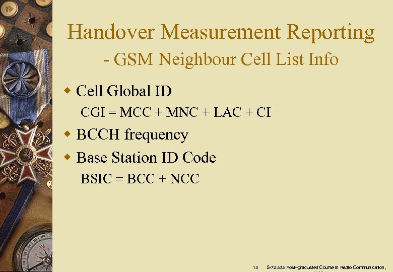 Handover Measurement Reporting - GSM Neighbour Cell List Info w Cell Global ID CGI = MCC + MNC + LAC + CI w BCCH frequency w Base Station ID Code BSIC = BCC + NCC 13 S-72. 333 Post–graduated Course in Radio Communication,