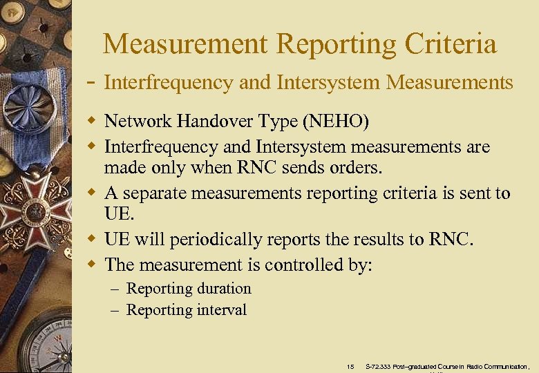 Measurement Reporting Criteria - Intrafrequency Measurements w Mobile Equipment Handover Type (MEHO) w RAN broadcasts the measurements reporting criteria for intrafrequency measurements in BCCH. w When criteria is fulfilled, UE reports the measurement results to RNC. w RNC makes the HO decisions. 14 S-72. 333 Post–graduated Course in Radio Communication,