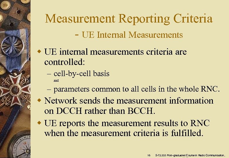 Measurement Reporting Criteria - Interfrequency and Intersystem Measurements w Network Handover Type (NEHO) w Interfrequency and Intersystem measurements are made only when RNC sends orders. w A separate measurements reporting criteria is sent to UE. w UE will periodically reports the results to RNC. w The measurement is controlled by: – Reporting duration – Reporting interval 15 S-72. 333 Post–graduated Course in Radio Communication,
