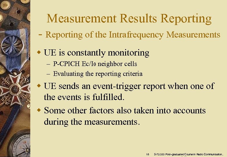 Measurement Results Reporting w Event-triggered intrafrequency measurement report w Periodic intrafrequency measurement report w Intersystem measurement report w Measurement reports on common channels w Quality deterioration report 17 S-72. 333 Post–graduated Course in Radio Communication,