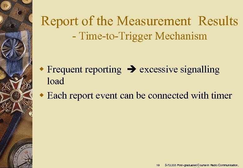 Report of the Measurement Results - Time-to-Trigger Mechanism w Frequent reporting excessive signalling load w Each report event can be connected with timer 19 S-72. 333 Post–graduated Course in Radio Communication,