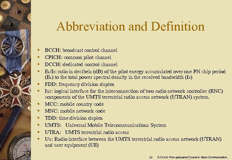 Abbreviation and Definition w w w BCCH: broadcast control channel CPICH: common pilot channel DCCH: dedicated control channel Ec/I 0: ratio in decibels (d. B) of the pilot energy accumulated over one PN chip period (Ec) to the total power spectral density in the received bandwidth (I 0) FDD: frequency division duplex Iur: logical interface for the interconnection of two radio network controller (RNC) components of the UMTS terrestrial radio access network (UTRAN) system. MCC: mobile country code MNC: mobile network code TDD: time division duplex UMTS: Universal Mobile Telecommunications System UTRA: UMTS terrestrial radio access Uu: Radio interface between the UMTS terrestrial radio access network (UTRAN) and user equipment (UE) 22 S-72. 333 Post–graduated Course in Radio Communication,