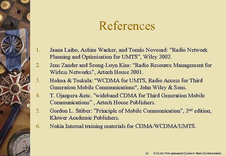 References 1. 2. 3. 4. 5. 6. Jaana Laiho, Achim Wacker, and Tomás Novosad: “Radio Network Planning and Optimisation for UMTS”, Wiley 2002. Jens Zander and Seong-Luyn Kim: “Radio Resource Management for Wirless Networks”, Artech House 2001. Holma & Toskala: "WCDMA for UMTS, Radio Access for Third Generation Mobile Communications", John Wiley & Sons. T. Ojanpera &etc. ”wideband CDMA for Third Generation Mobile Communications” , Artech House Publishers. Gordon L. Stüber: ”Principle of Mobile Communication”, 2 nd edition, Kluwer Academic Publishers. Nokia Internal training materials for CDMA/WCDMA/UMTS. 23 S-72. 333 Post–graduated Course in Radio Communication,