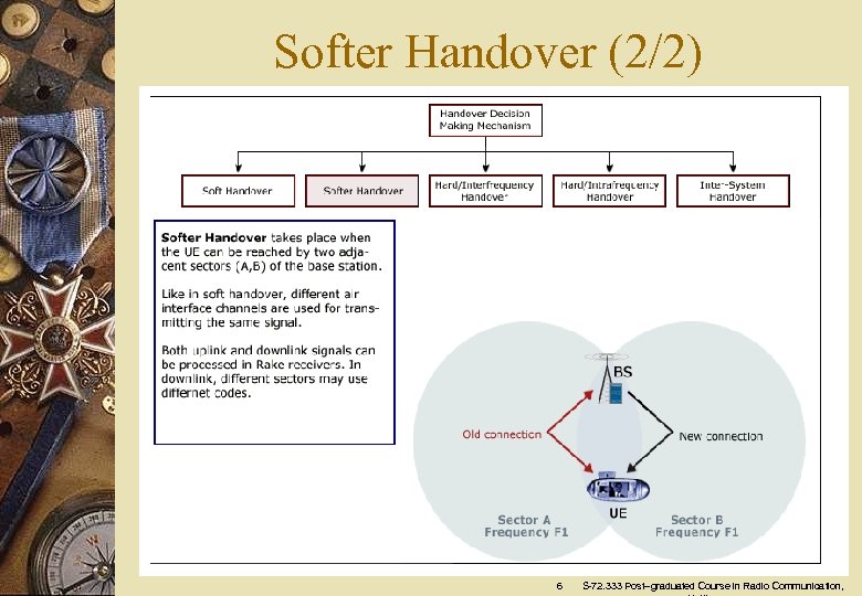 Softer Handover (1/2) A softer handover is performed between two adjacent sectors of the same base station. w In downlink, soft and softer handover is very similar from the terminal point of view (signal replicas are simply combined in the Rake receiver). w In uplink, there is a major difference between soft and softer handover. – In soft handover branches, signal replicas can only be combined within the Radio Network Controller (RNC) – In softer handover branches, signal replicas can be combined earlier - within the base station. 5 S-72. 333 Post–graduated Course in Radio Communication,