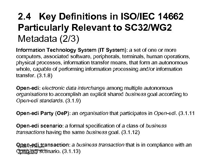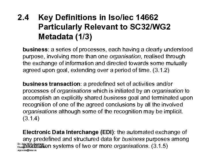 2. 4 Key Definitions in Iso/iec 14662 Particularly Relevant to SC 32/WG 2 Metadata (1/3) business: a series of processes, each having a clearly understood purpose, involving more than one organisation, realised through the exchange of information and directed towards some mutually agreed upon goal, extending over a period of time. (3. 1. 2) business transaction: a predefined set of activities and/or processes of organisations which is initiated by an organisation to accomplish an explicitly shared business goal and terminated upon recognition of one of the agreed conclusions by all the involved organisations although some of the recognition may be implicit. (3. 1. 4) Electronic Data Interchange (EDI): the automated exchange of any predefined and structured data for business purposes among Dr. Jake V. Th. Knoppers information systems of two or more organisations. (3. 1. 5) Canaglobe International Inc. mpereira@istar. ca