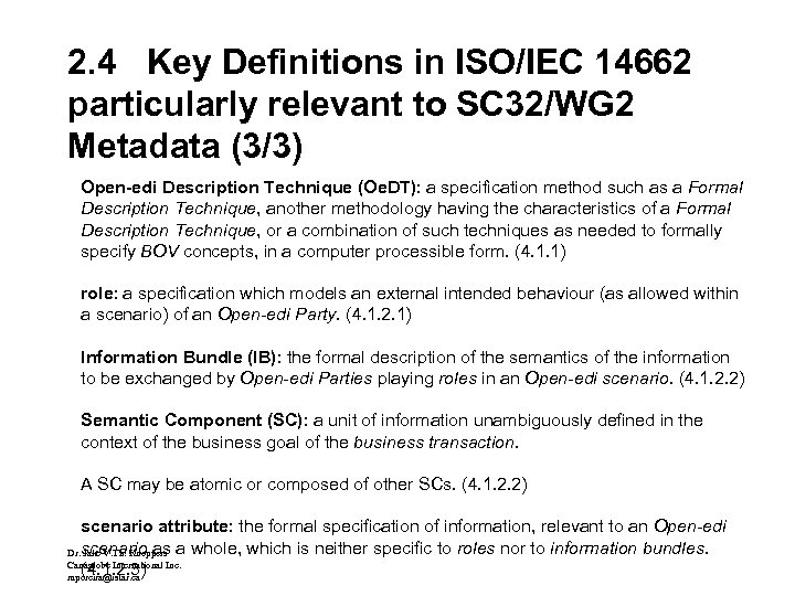 2. 4 Key Definitions in ISO/IEC 14662 particularly relevant to SC 32/WG 2 Metadata (3/3) Open-edi Description Technique (Oe. DT): a specification method such as a Formal Description Technique, another methodology having the characteristics of a Formal Description Technique, or a combination of such techniques as needed to formally specify BOV concepts, in a computer processible form. (4. 1. 1) role: a specification which models an external intended behaviour (as allowed within a scenario) of an Open-edi Party. (4. 1. 2. 1) Information Bundle (IB): the formal description of the semantics of the information to be exchanged by Open-edi Parties playing roles in an Open-edi scenario. (4. 1. 2. 2) Semantic Component (SC): a unit of information unambiguously defined in the context of the business goal of the business transaction. A SC may be atomic or composed of other SCs. (4. 1. 2. 2) scenario attribute: the formal specification of information, relevant to an Open-edi Dr. scenario as a whole, which is neither specific to roles nor to information bundles. Jake V. Th. Knoppers Canaglobe International Inc. (4. 1. 2. 3) mpereira@istar. ca