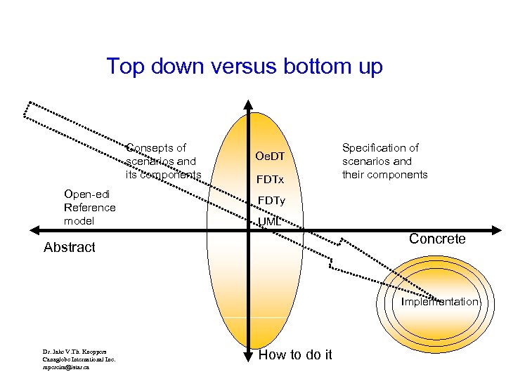 Top down versus bottom up Consepts of scenarios and its components Open-edi Reference model Oe. DT FDTx Specification of scenarios and their components FDTy UML Concrete Abstract Implementation Dr. Jake V. Th. Knoppers Canaglobe International Inc. mpereira@istar. ca How to do it