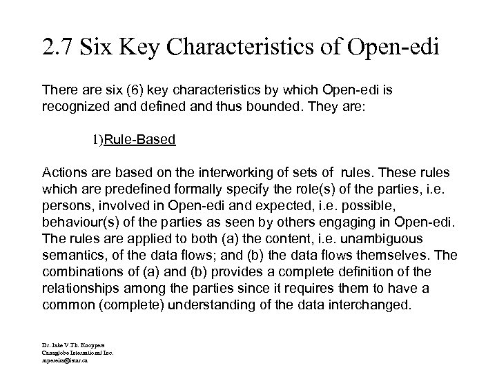 2. 7 Six Key Characteristics of Open-edi There are six (6) key characteristics by which Open-edi is recognized and defined and thus bounded. They are: 1)Rule-Based Actions are based on the interworking of sets of rules. These rules which are predefined formally specify the role(s) of the parties, i. e. persons, involved in Open-edi and expected, i. e. possible, behaviour(s) of the parties as seen by others engaging in Open-edi. The rules are applied to both (a) the content, i. e. unambiguous semantics, of the data flows; and (b) the data flows themselves. The combinations of (a) and (b) provides a complete definition of the relationships among the parties since it requires them to have a common (complete) understanding of the data interchanged. Dr. Jake V. Th. Knoppers Canaglobe International Inc. mpereira@istar. ca