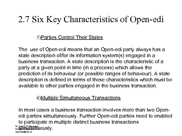 2. 7 Six Key Characteristics of Open-edi 5)Parties Control Their States The use of Open-edi means that an Open-edi party always has a state description of/for its information system(s) engaged in a business transaction. A state description is the characteristic of a party at a given point in time (in a process) which allows the prediction of its behaviour (or possible ranges of behaviour). A state description is defined in terms of those characteristics which must be available to other parties engaged in the business transaction. 6)Multiple Simultaneous Transactions In most cases a business transaction involves more than two Openedi parties simultaneously. Further Open-edi parties need to enabled to participate in multiple distinct business transactions Dr. Jake V. Th. Knoppers simultaneously. Canaglobe International Inc. mpereira@istar. ca