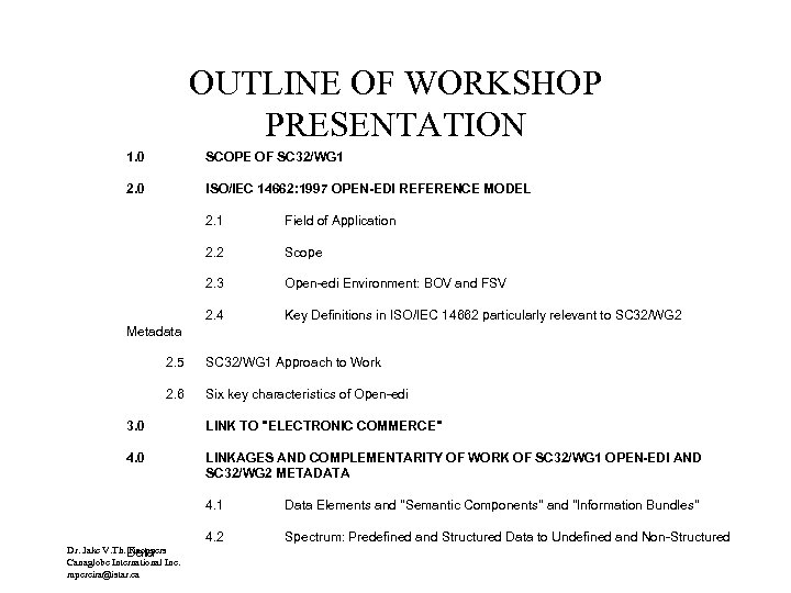 OUTLINE OF WORKSHOP PRESENTATION 1. 0 SCOPE OF SC 32/WG 1 2. 0 ISO/IEC 14662: 1997 OPEN-EDI REFERENCE MODEL 2. 1 Field of Application 2. 2 Scope 2. 3 Open-edi Environment: BOV and FSV 2. 4 Key Definitions in ISO/IEC 14662 particularly relevant to SC 32/WG 2 Metadata 2. 5 SC 32/WG 1 Approach to Work 2. 6 Six key characteristics of Open-edi 3. 0 LINK TO "ELECTRONIC COMMERCE" 4. 0 LINKAGES AND COMPLEMENTARITY OF WORK OF SC 32/WG 1 OPEN-EDI AND SC 32/WG 2 METADATA 4. 1 4. 2 Dr. Jake V. Th. Data Knoppers Canaglobe International Inc. mpereira@istar. ca Data Elements and "Semantic Components" and "Information Bundles" Spectrum: Predefined and Structured Data to Undefined and Non-Structured