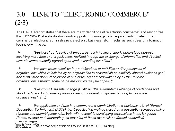 3. 0 LINK TO "ELECTRONIC COMMERCE" (2/3) The BT-EC Report states that there are many definitions of “electronic commerce” and recognizes this. SC 32/WG 1 standardization work supports common generic requirements of electronic commerce, electronic administration, electronic business, etc. insofar as such uses of information technology involve: "business" as "a series of processes, each having a clearly understood purpose, involving more than one organization, realized through the exchange of information and directed towards some mutually agreed upon goal, extending over time”; business transaction" as "a predefined set of activities and/or processes of organizations which is initiated by an organization to accomplish an explicitly shared business goal and terminated upon recognition of one of the agreed conclusions by all the involved organizations although some of the recognition may be implicit"; "Electronic Data Interchange (EDI)" as "the automated exchange of predefined and structured data for business purposes among information systems among two or more organizations"; and, the application and use in e-commerce, e-administration , e-business, etc. of "Formal Description Technique(s) (FDTs), i. e. "specification method based on a description language using rigorous and unambiguous rules both with respect to developing expressions in the language (formal syntax) and interpreting the meaning of these expressions (formal semantics) Dr. Jake V. Th. Knoppers Canaglobe International Inc. [Note: mpereira@istar. ca The above are definitions found in ISO/IEC IS 14662]