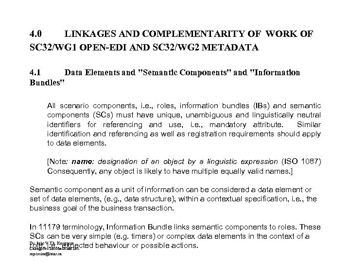 4. 0 LINKAGES AND COMPLEMENTARITY OF WORK OF SC 32/WG 1 OPEN-EDI AND SC 32/WG 2 METADATA 4. 1 Data Elements and "Semantic Components" and "Information Bundles" All scenario components, i. e. , roles, information bundles (IBs) and semantic components (SCs) must have unique, unambiguous and linguistically neutral identifiers for referencing and use, i. e. , mandatory attribute. Similar identification and referencing as well as registration requirements should apply to data elements. [Note: name: designation of an object by a linguistic expression (ISO 1087) Consequently, any object is likely to have multiple equally valid names. ] Semantic component as a unit of information can be considered a data element or set of data elements, (e. g. , data structure), within a contextual specification, i. e. , the business goal of the business transaction. In 11179 terminology, Information Bundle links semantic components to roles. These SCs can be very simple (e. g. timers) or complex data elements in the context of a Dr. Jake V. Th. Knoppers role, i. e. , expected behaviour or possible actions. Canaglobe International Inc. mpereira@istar. ca