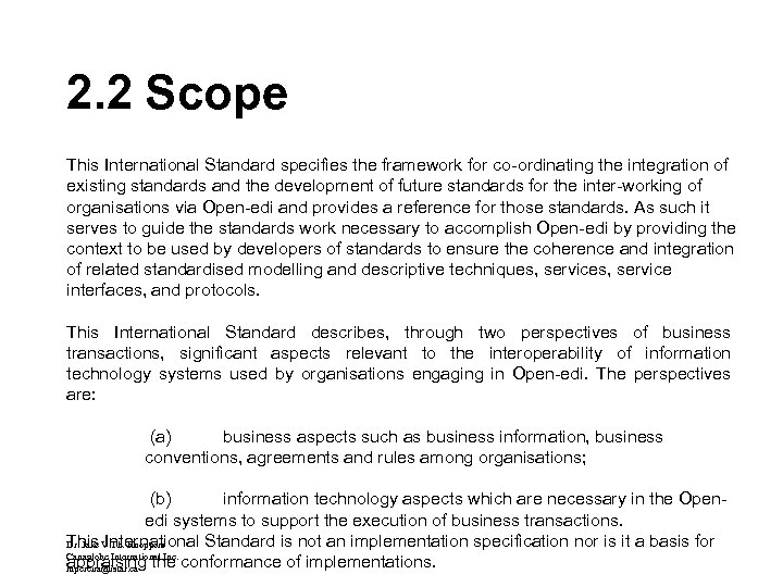 2. 2 Scope This International Standard specifies the framework for co-ordinating the integration of existing standards and the development of future standards for the inter-working of organisations via Open-edi and provides a reference for those standards. As such it serves to guide the standards work necessary to accomplish Open-edi by providing the context to be used by developers of standards to ensure the coherence and integration of related standardised modelling and descriptive techniques, service interfaces, and protocols. This International Standard describes, through two perspectives of business transactions, significant aspects relevant to the interoperability of information technology systems used by organisations engaging in Open-edi. The perspectives are: (a) business aspects such as business information, business conventions, agreements and rules among organisations; (b) information technology aspects which are necessary in the Openedi systems to support the execution of business transactions. This International Standard is not an implementation specification nor is it a basis for Dr. Jake V. Th. Knoppers Canaglobe International Inc. appraising mpereira@istar. ca the conformance of implementations.