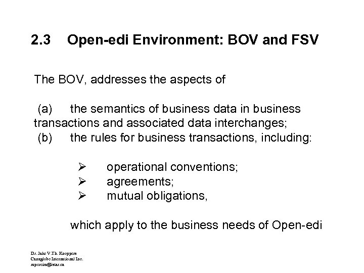 2. 3 Open-edi Environment: BOV and FSV The BOV, addresses the aspects of (a) the semantics of business data in business transactions and associated data interchanges; (b) the rules for business transactions, including: operational conventions; agreements; mutual obligations, which apply to the business needs of Open-edi Dr. Jake V. Th. Knoppers Canaglobe International Inc. mpereira@istar. ca