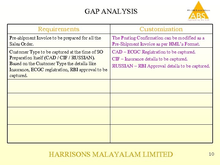 GAP ANALYSIS Requirements Pre-shipment Invoice to be prepared for all the Sales Order. Customization The Posting Confirmation can be modified as a Pre-Shipment Invoice as per HML’s Format. Customer Type to be captured at the time of SO CAD – ECGC Registration to be captured. Preparation itself (CAD / CIF / RUSSIAN). CIF – Insurance details to be captured. Based on the Customer Type the details like RUSSIAN – RBI Approval details to be captured. Insurance, ECGC registration, RBI approval to be captured. HARRISONS MALAYALAM LIMITED 10