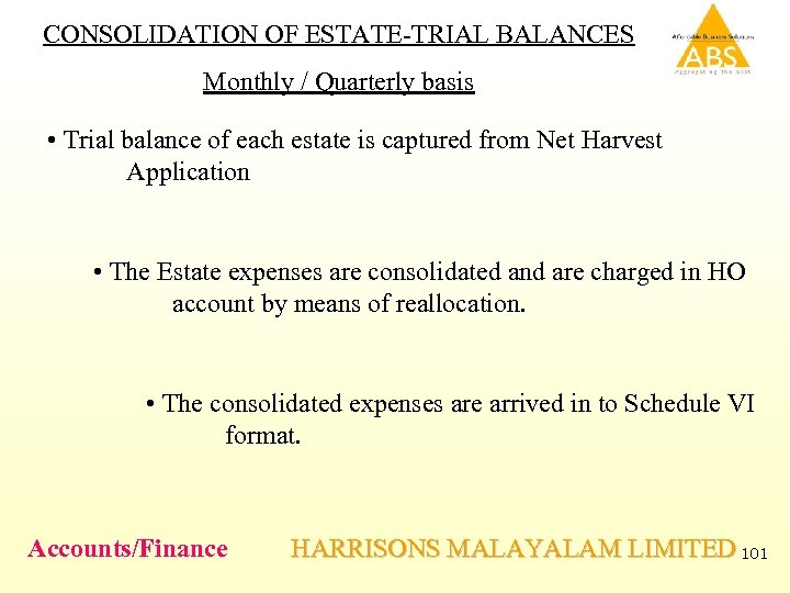 CONSOLIDATION OF ESTATE-TRIAL BALANCES Monthly / Quarterly basis • Trial balance of each estate is captured from Net Harvest Application • The Estate expenses are consolidated and are charged in HO account by means of reallocation. • The consolidated expenses are arrived in to Schedule VI format. Accounts/Finance HARRISONS MALAYALAM LIMITED 101